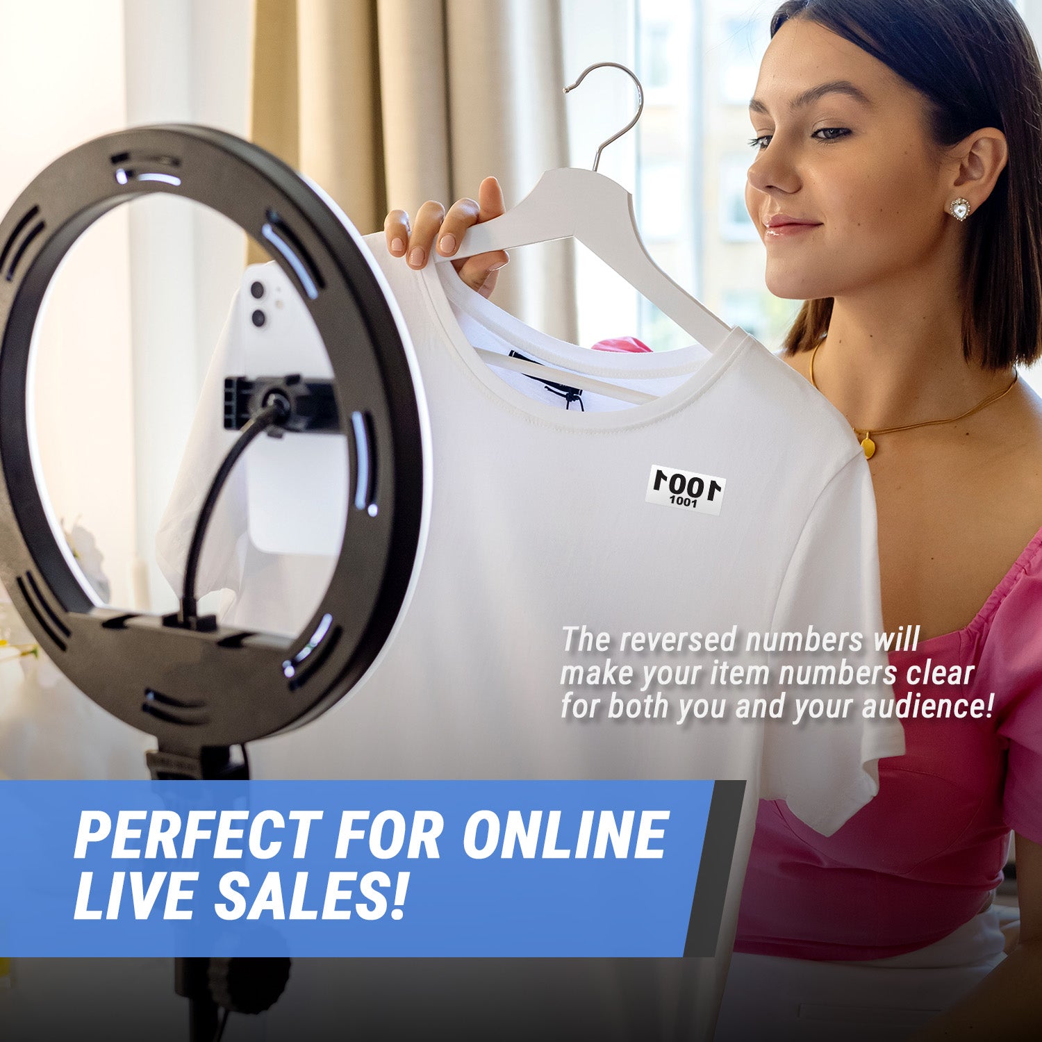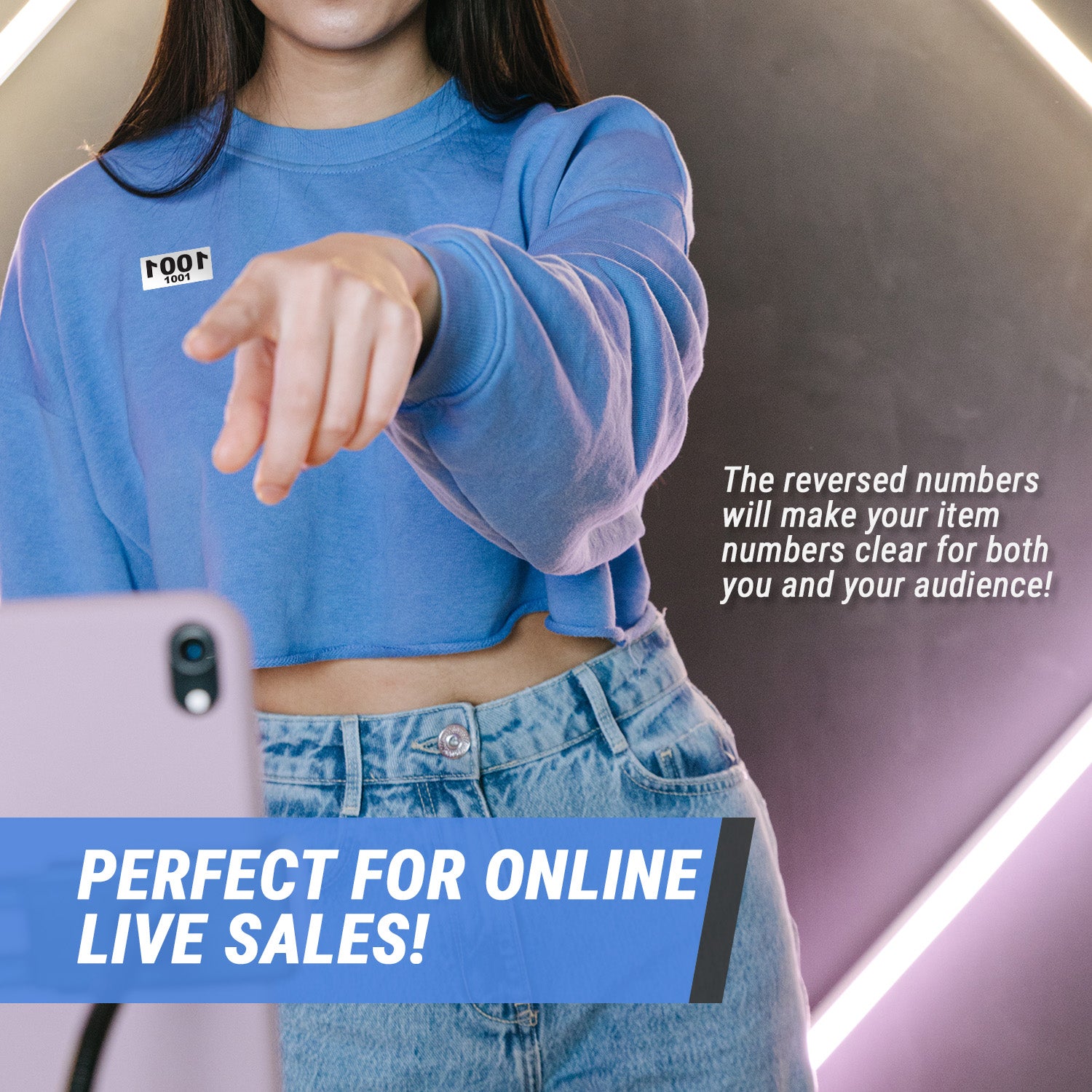 - Reverse Mirrored Numbers: Pre printed consecutive number stickers designed so viewers can easily see numbers during live sales.