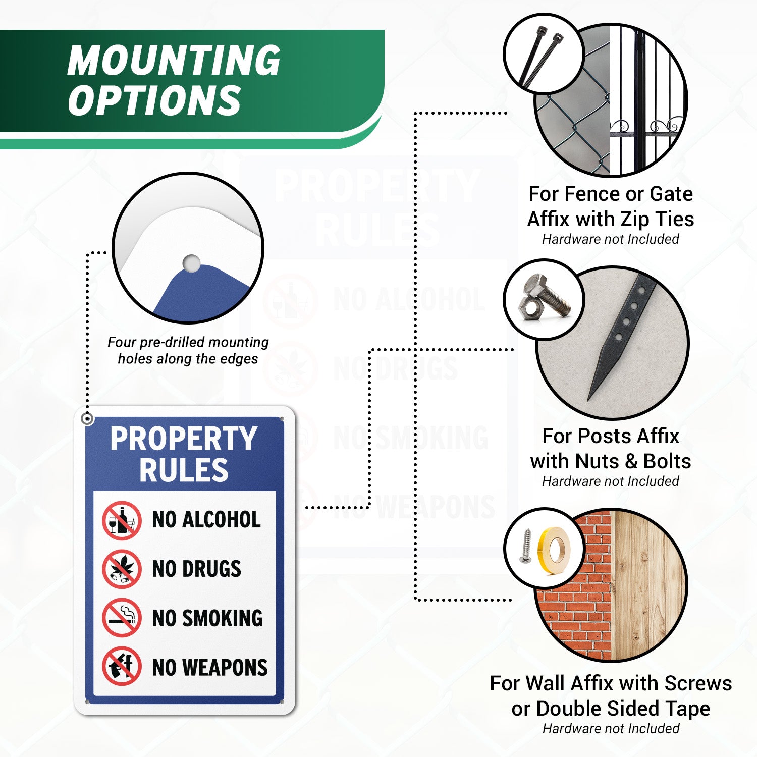 Ensure your home, Airbnb, or business is protected with this clear Property Rules yard sign. Bold, high contrast text highlights prohibited activities including alcohol, drugs, smoking, and weapons. Perfect for homes, offices, and private properties, this sign helps prevent dangerous or illegal activity while keeping your space safe and secure.