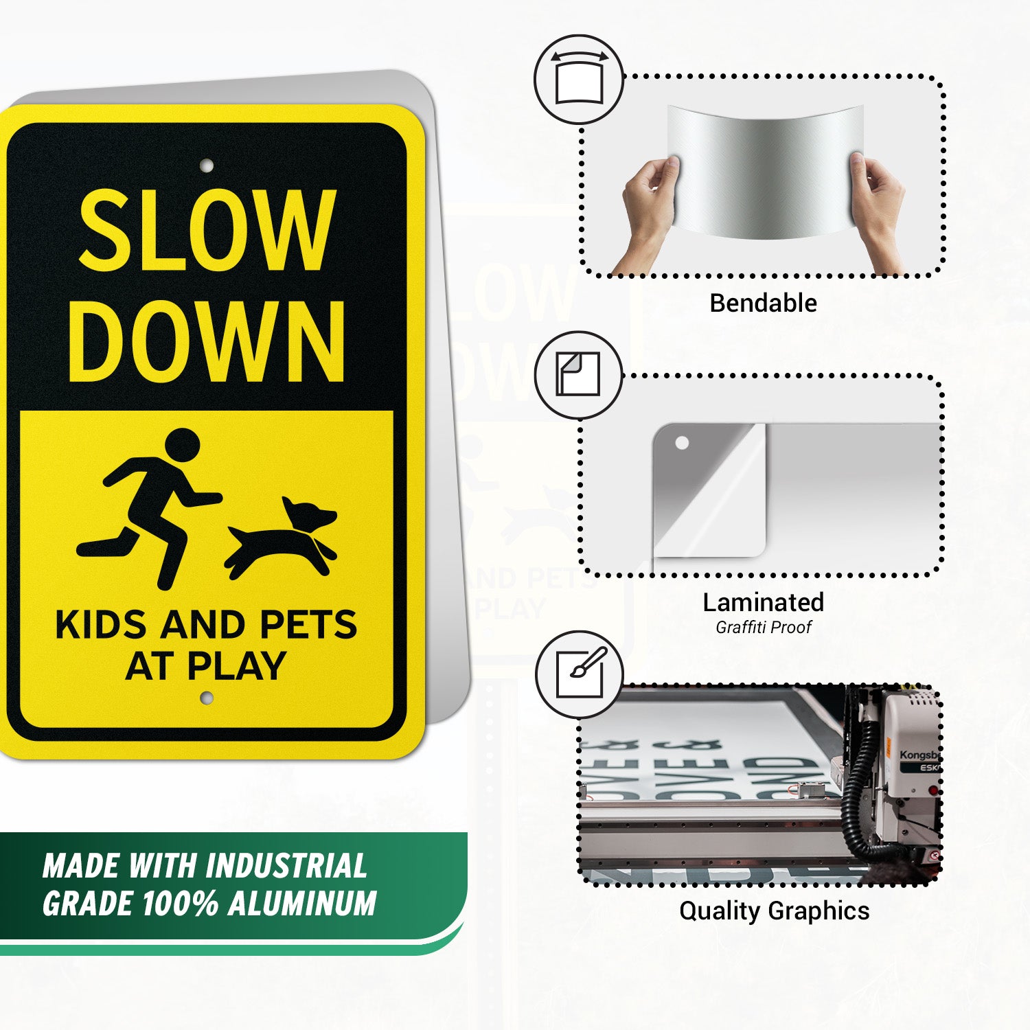 This yard sign clearly warns drivers to slow down, keeping children and pets safe in residential areas. Its professional grade aluminum construction ensures long lasting outdoor use in all weather conditions.